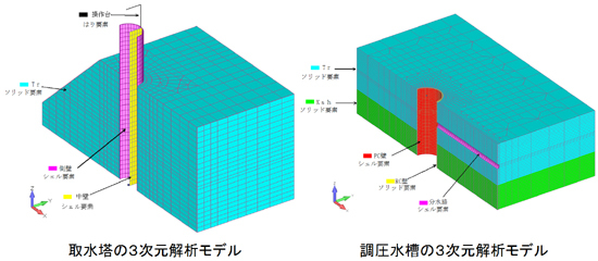 また、上記には、地盤を含めて取水塔と調圧水槽をモデル化した例を示します。構造物はシェル要素で、地盤は3次元ソリッド要素でモデル化し、動的解析による安全性照査を行ったものです。