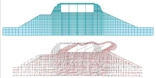 構造物形状が複雑な場合や、地盤の不整形がある場合、保有水平耐久力法や応答変位法などの静的照査法の適用が難しい場合があります。その場合には、動的照査法により耐震性能の検討が行われます。上に示す例は、地盤と構造物を一体でモデル化して動的解析を実施したものです。