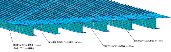 合成床版橋の設計計算は、格子理論に基づいて実施されるのが一般的ですが、斜橋などでは計算精度が低下する場合があります。上図に示す例は、45度斜橋の合成床版橋に関して、全体モデルの3次元FEM解析を用い、応力度の検証を実施したものです。