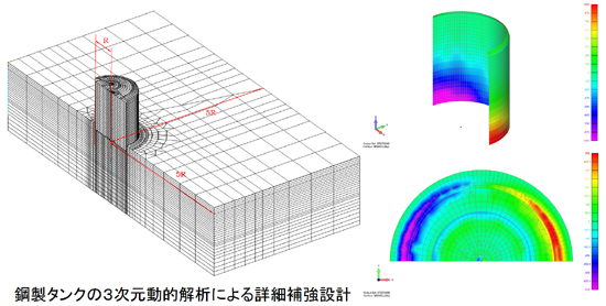 また、上記には、地盤を含めて取水塔と調圧水槽をモデル化した例を示します。構造物はシェル要素で、地盤は3次元ソリッド要素でモデル化し、動的解析による安全性照査を行ったものです。