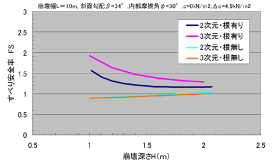 斜面防災の取り組み 3次元斜面安定解析による植生が斜面強度に及ぼす影響検討 降雨時や地震時など、斜面が地滑りを起こし家屋などが被害を受けることがあります。上に示す例は、斜面安定解析を用いて、樹木根の存在が地斜面滑り安全率に及ぼす影響を検討したものです。 Works一覧へ